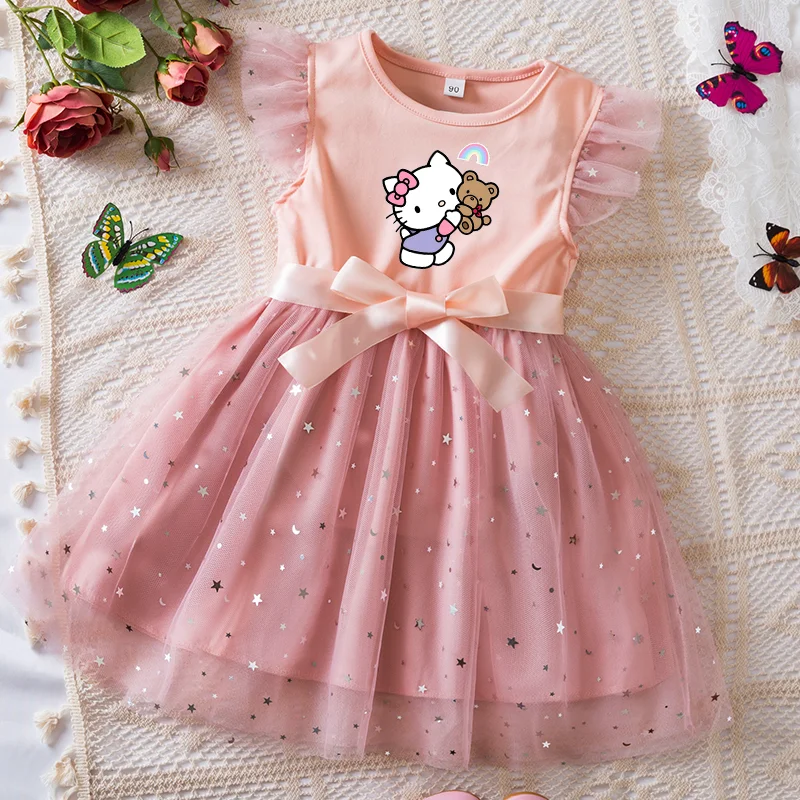 Hello Kitty robe Tutu à paillettes pour fille, avec nœud, manches flottantes, tenue de fête princesse d’été pour enfants de 2 à 6 ans.